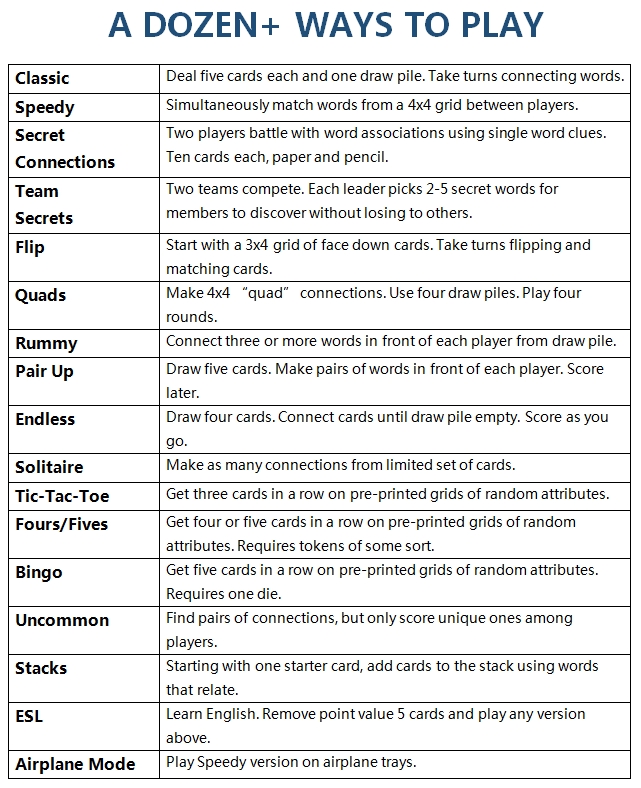 Classic Connections is the original game. It has 124 cards with 496 generic words. Over 1,800 copies of the Classic Connections game have been sold since 2016. So many in fact that the original game is "sold out". However, it has been recreated as "SideLinks". Same game, more cards, bigger cards. Available at stores worldwide.